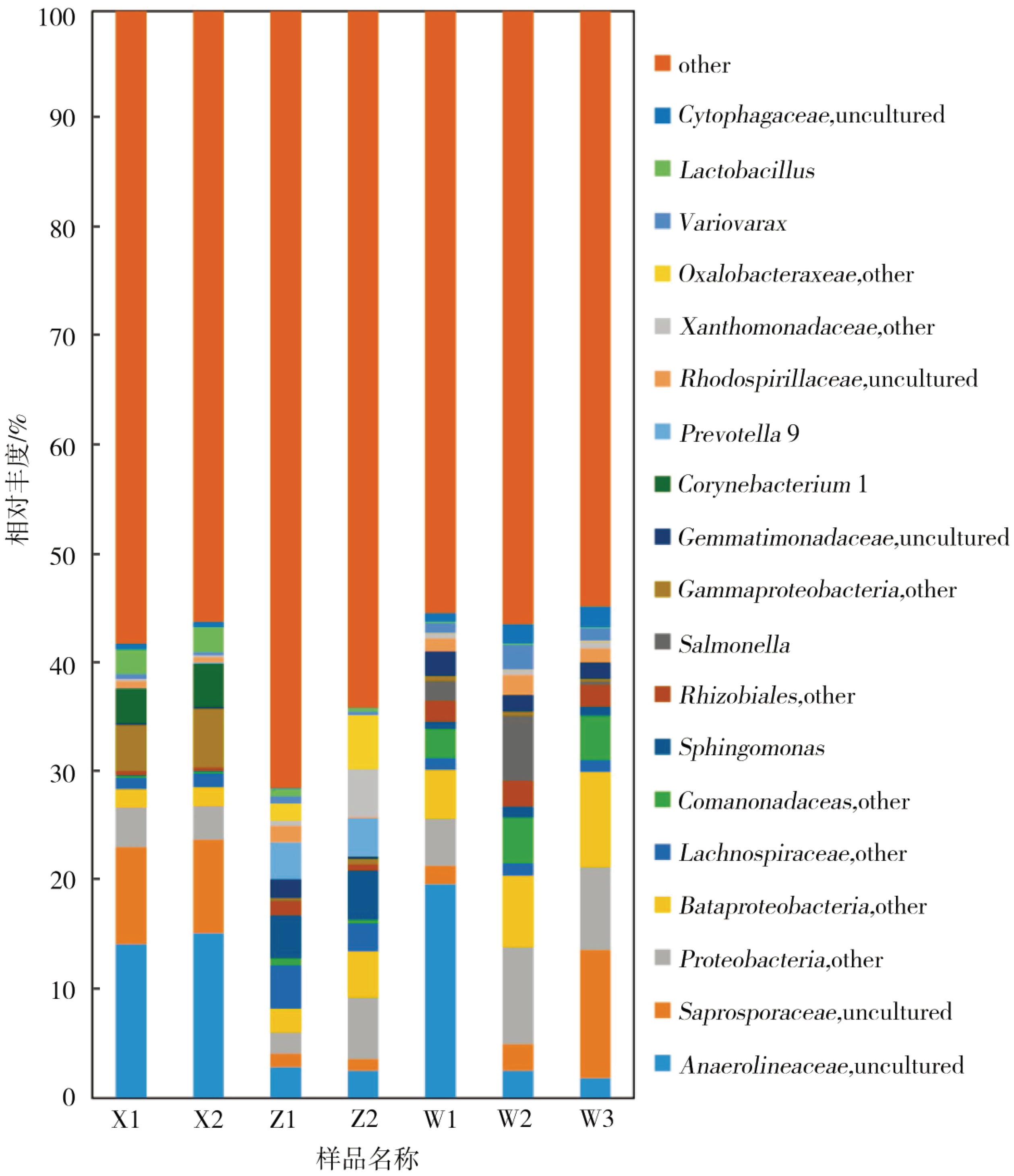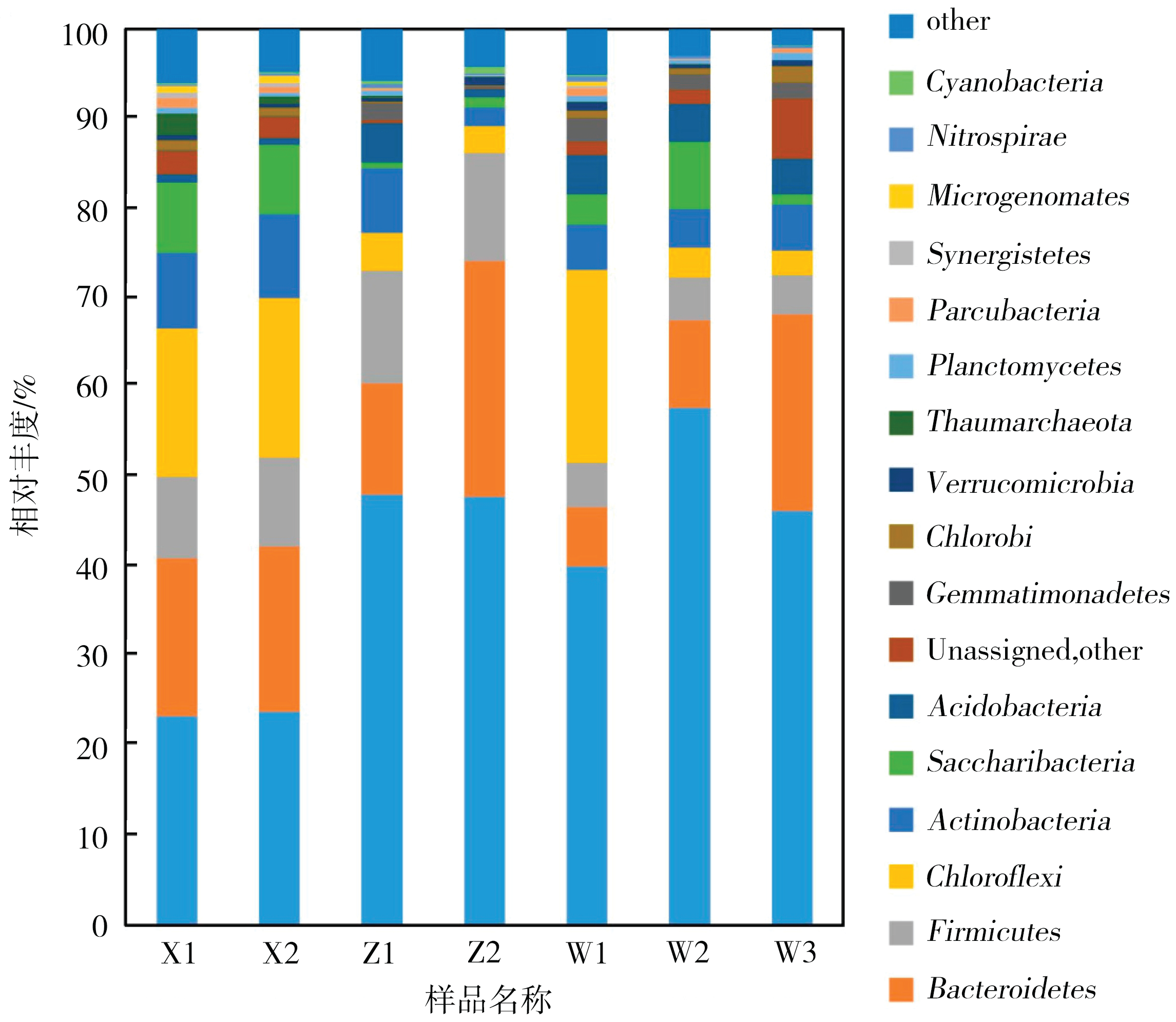 根據(jù)主成分分析得到各樣本OTU數(shù)據(jù)的因子載荷,其是污泥樣品中微生物群落結(jié)構(gòu)和功能的具體反映。圖4為污水廠及AO反應(yīng)器7個樣品的微生物群落主成分分析圖,反映了不同進(jìn)水成分污泥樣品的因子載荷變化,樣本間空間距離較近,表明物種組成相對類似。如圖4所示,橫坐標(biāo)PC1貢獻(xiàn)度為66.3%,PC2貢獻(xiàn)度為29.1%,PC3貢獻(xiàn)度為2.5%,污水廠樣品分布在一側(cè),離散程度較高,實驗室AO反應(yīng)器中W1、W2和W3微生物群落結(jié)構(gòu)相似度較高。X1、X2距離相對于Z1和Z2較遠(yuǎn),W2、W3距離相對于W1距離較近。綜上分析,污水廠缺氧段好氧段中存在專屬菌群,其差異大,水處理效果良好,郭小馬等的研究結(jié)果與本研究結(jié)果類似,在COD和氨氮去除率分別達(dá)到81%和91%時,缺氧段與好氧段微生物種類無明顯差異但相對數(shù)量差異明顯。而實驗室AO反應(yīng)器反應(yīng)體系較小,微生物群落結(jié)構(gòu)差異相對較小。