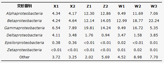 對各樣品變形菌門微生物的分布特征進(jìn)行分析,結(jié)果見表2。