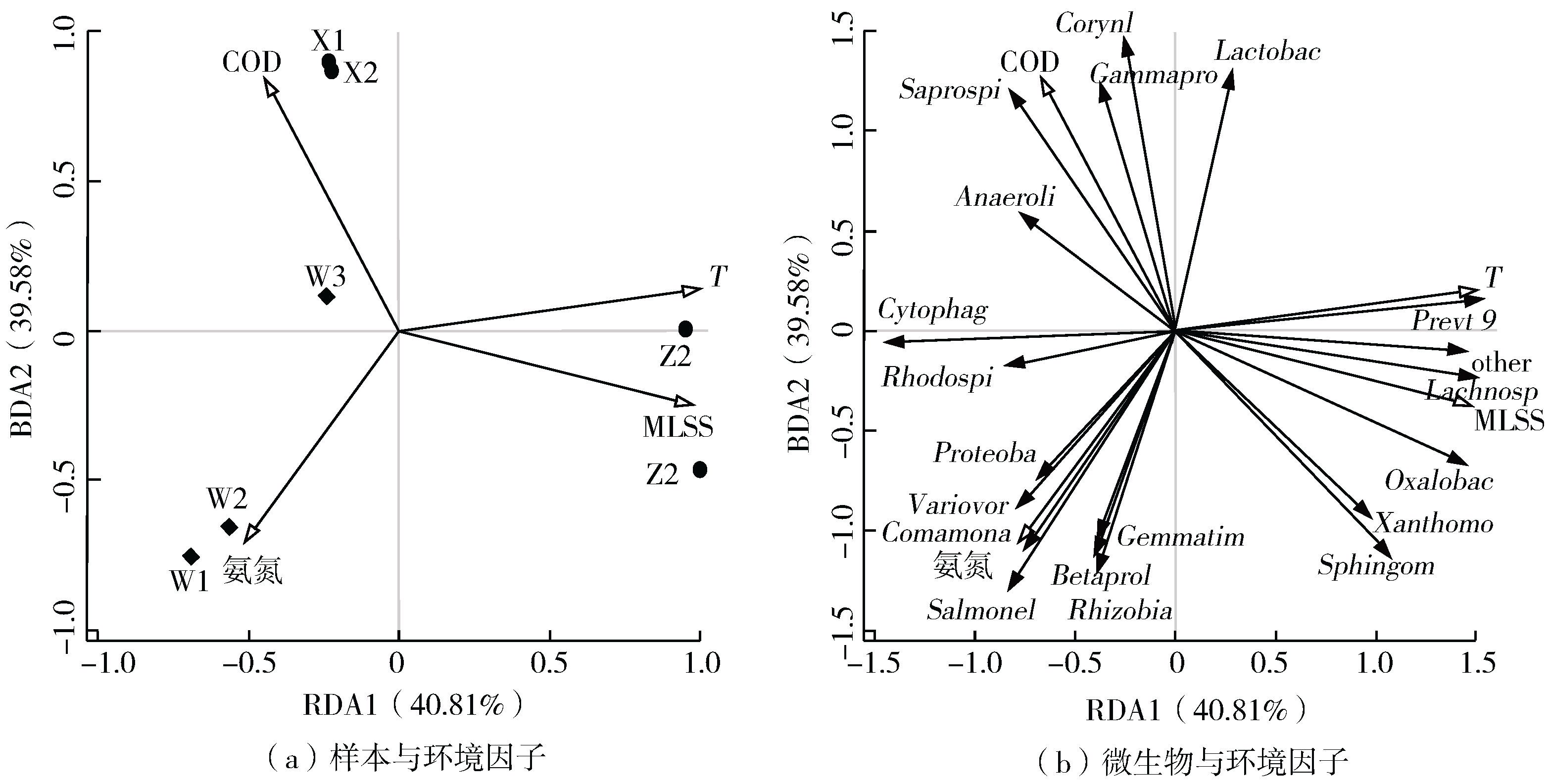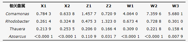 本研究選取污泥濃度(MLSS)、COD、氨氮(ammonia)和溫度(T)作為環(huán)境因子,結(jié)合各樣本微生物群落結(jié)構(gòu),利用冗余分析(RDA)研究微生物與環(huán)境因子的相關(guān)性。結(jié)果(見圖7)表明,主軸1和主軸2共解釋了微生物群落結(jié)構(gòu)與水質(zhì)參數(shù)總變異的80.31%,污水廠樣品中,X1、X2分布較近,與Z1、Z2相同,而實驗室AO裝置分布較遠(yuǎn),水質(zhì)處理較差的W1、W2分布較近,而W3距離較遠(yuǎn)。并且實驗室裝置前期受氨氮影響較大。X1、X2期間受COD影響較大,經(jīng)調(diào)試污泥停留時間后,Z1、Z2污泥濃度增加。微生物群落中Corynebacterium和Saprospiraceae受COD影響較大,Comamonadaceae、Salmonella以及Variovorax受氨氮影響較大。Oxalobacteraceae及Lactobacillus與污泥濃度相關(guān)。