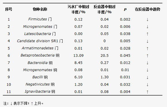 表4 污水廠與反應(yīng)器門、綱水平上物種相對豐度的差異
