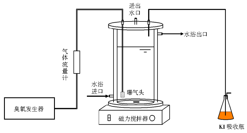 臭氧氧化實(shí)驗(yàn)裝置如圖1所示。該裝置主體反應(yīng)器有效體積為4.5 L,臭氧發(fā)生器(廣州佳環(huán)電器科技有限公司,HY-006-2CA)出口流量通過氣體流量計(jì)調(diào)節(jié)控制在60 L·h−1,未反應(yīng)的氣體通入20% KI溶液進(jìn)行吸收。整個(gè)反應(yīng)裝置通過水浴調(diào)節(jié)使得反應(yīng)溫度控制在20 ℃,該臭氧氧化系統(tǒng)通過調(diào)節(jié)不同的反應(yīng)時(shí)間來控制臭氧投加量,整個(gè)反應(yīng)過程在通風(fēng)櫥內(nèi)進(jìn)行。