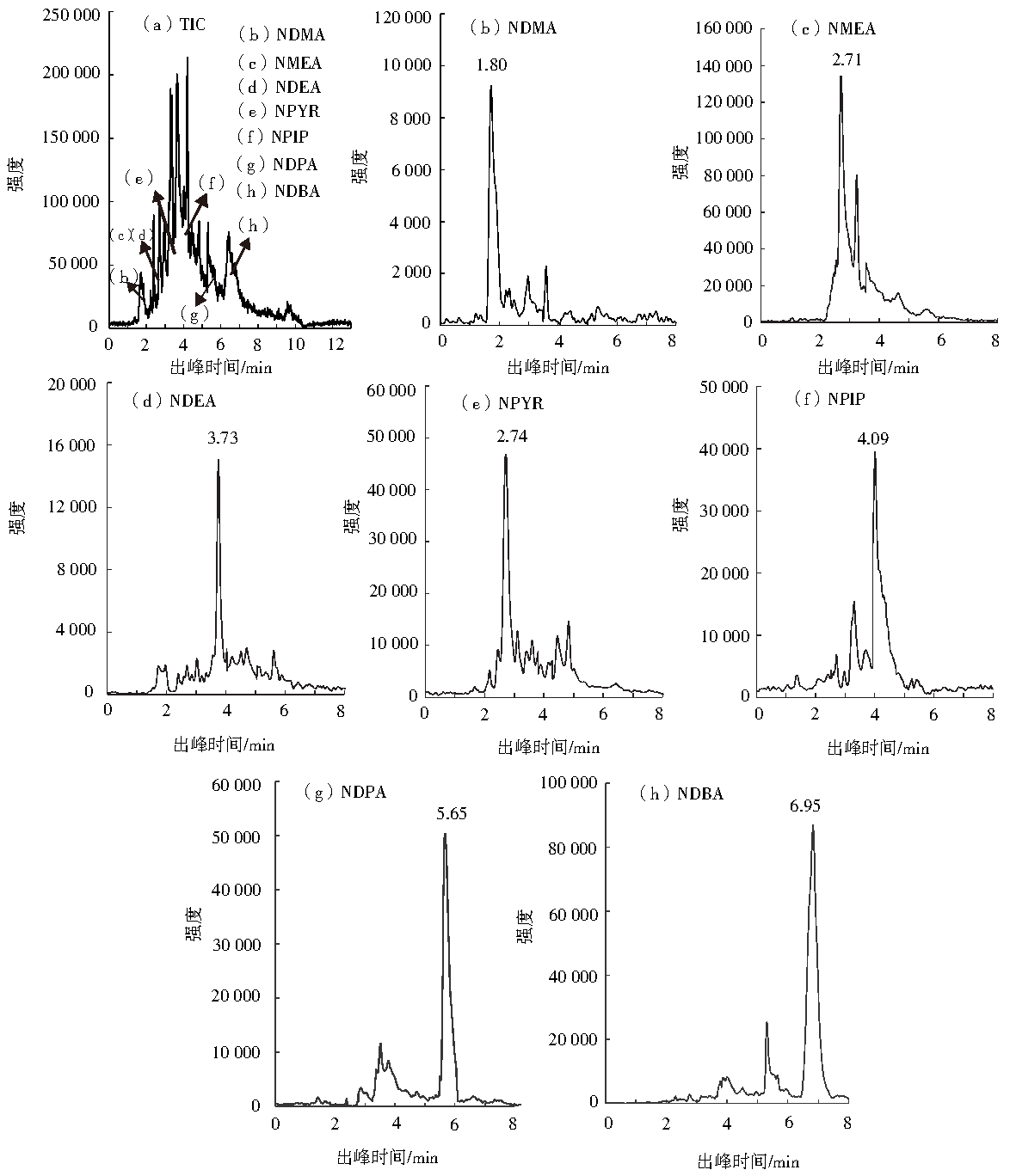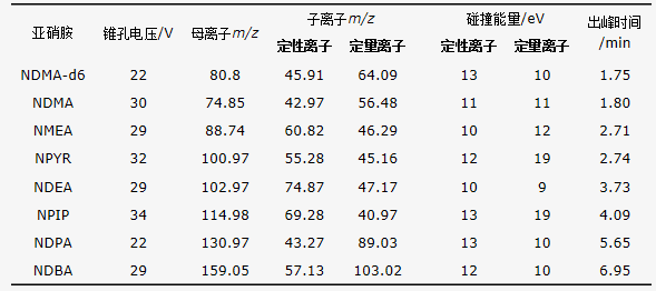 表1 N-亞硝胺的錐孔電壓、定性(量)離子、碰撞能量、出峰時(shí)間