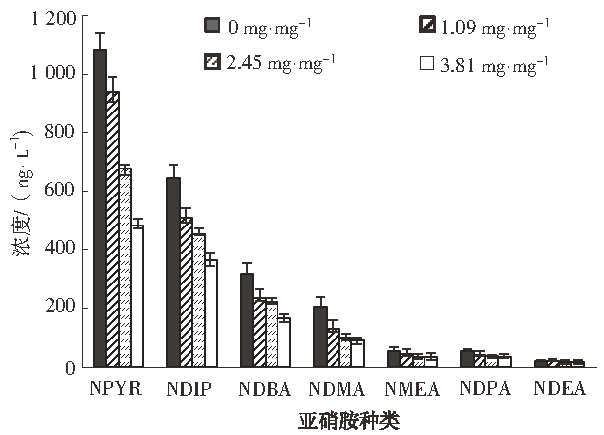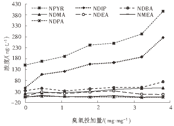 2.2 臭氧投加量對亞硝胺濃度的影響