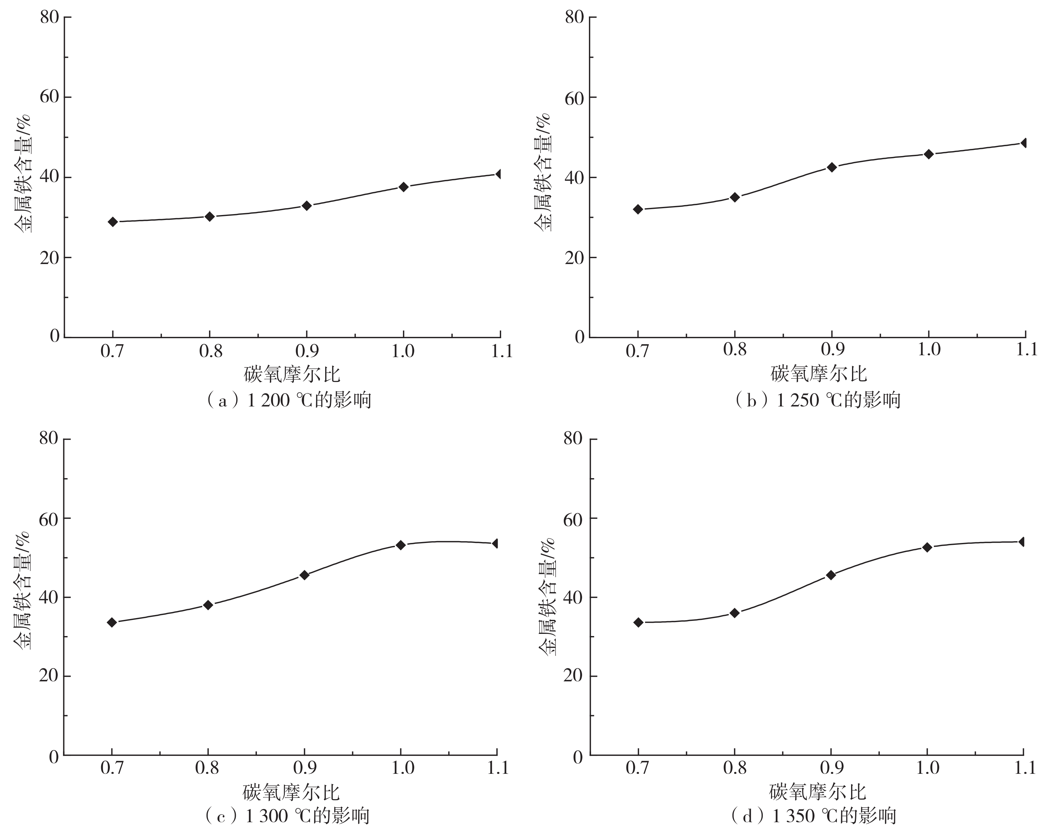 在生球團C/O為0.7、0.8、0.9、1.0、1.1,還原溫度1 200~1 350 ℃,還原時間20 min的條件下,對球團進行還原實驗,研究了不同溫度下C/O對球團中金屬鐵含量的影響。