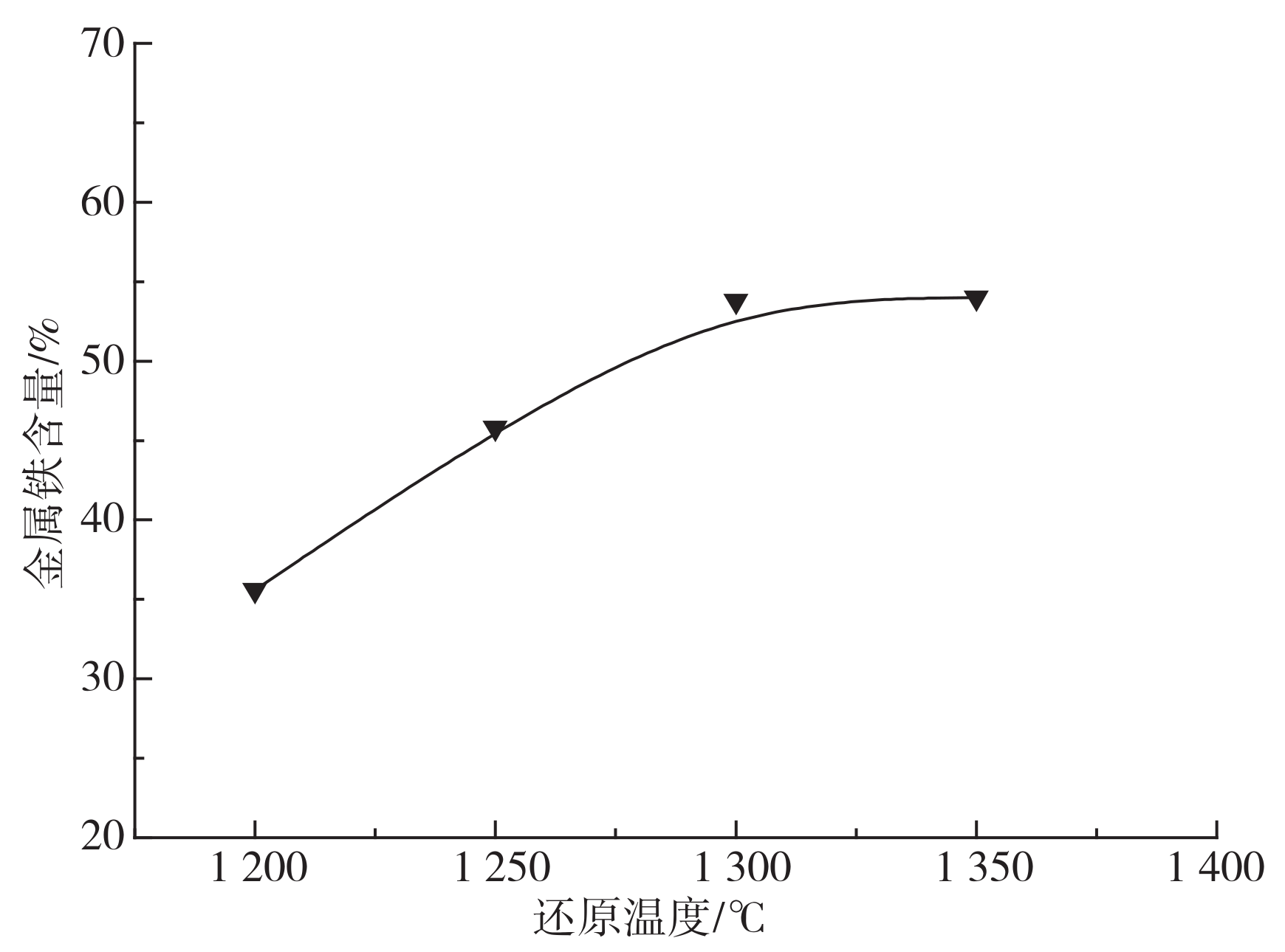 圖3 還原溫度對球團金屬鐵含量的影響