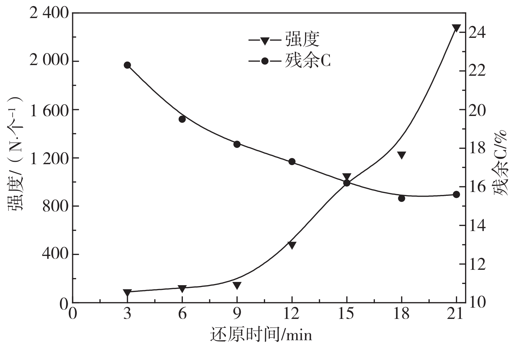 還原時間對球團抗壓強度和殘?zhí)己康挠绊懸妶D5。實驗所用的生球團C/O為1.0,溫度1 300 ℃,還原時間為3~21 min(間隔3 min)。