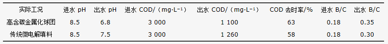 實驗對在1 300 ℃,C/O為1.0,還原時間20 min條件下制備的高含碳金屬化球團與傳統(tǒng)微電解填料的焦化廢水處理效果進行了比較分析。廢水為某焦化廠的焦化廢水,工藝為原水微電解(120 min)+Fenton(H2O2比例1‰)催化氧化,反應(yīng)器中焦化廢水量為3 L,填料的配加量為2.5 kg。初始pH調(diào)整到3.0,曝氣時間60 min,取上清液進行測定。處理效果如表4所示。由表4可知,高含碳金屬化球團對焦化廢水的處理效果明顯優(yōu)于傳統(tǒng)微電解填料,COD去除率可達63%,B/C值明顯提高,提高了廢水的可生化性。