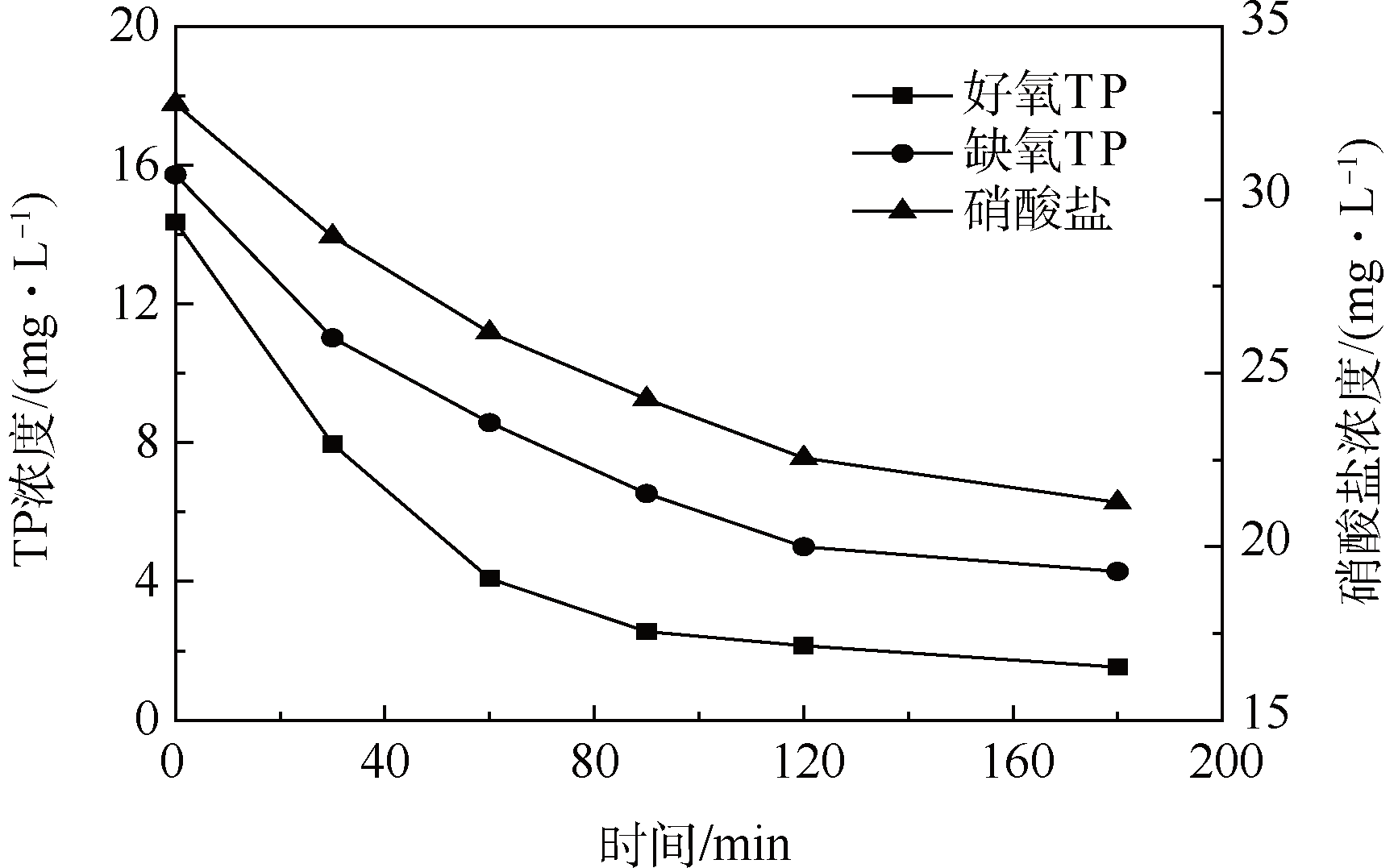 圖6 好氧吸磷、缺氧吸磷實驗中TP濃度隨時間的變化
