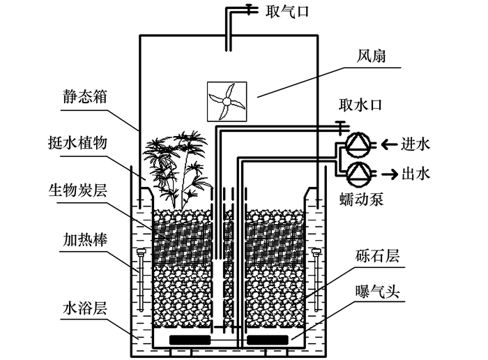 本實(shí)驗(yàn)生物炭原料為蘆竹秸稈, 洗凈烘干后置于氣氛爐(SMX1100-20, 上海尚群, 中國(guó))中, 以10℃·min-1的升溫速率, 在終溫500℃熱解炭化2 h獲得.所獲得生物炭的比表面積為345.92 m2·g-1, 孔徑為1.95 nm, 孔容為0.2467 cm3·g-1.濕地植物選用旱傘草(Cyperus alternifolius L.), 經(jīng)實(shí)驗(yàn)室馴化后以36株·m-2的種植密度植入濕地系統(tǒng).污泥取自某生活污水處理廠, 經(jīng)實(shí)驗(yàn)室馴化后接種濕地系統(tǒng).