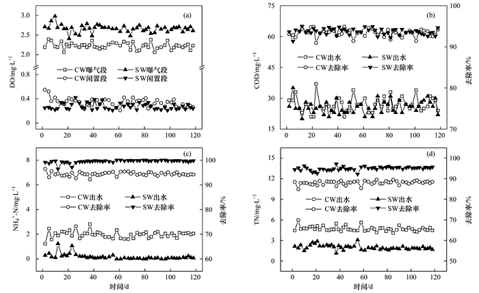 系統(tǒng)周期內(nèi)水質(zhì)跟蹤測(cè)定結(jié)果如圖 3所示.CW和SW進(jìn)水后半個(gè)小時(shí)內(nèi)系統(tǒng)DO迅速降至2.11 mg·L-1和2.67 mg·L-1, 隨后CW和SW系統(tǒng)曝氣段DO穩(wěn)定在2.2 mg·L-1和2.5 mg·L-1, 閑置段DO水平約為0.3 mg·L-1和0.2 mg·L-1.閑置段初期, SW系統(tǒng)DO下降速度明顯快于CW系統(tǒng).生物炭相對(duì)礫石來(lái)說(shuō), 其發(fā)達(dá)的空隙結(jié)構(gòu)和比表面積不僅改善了系統(tǒng)通氣性, 促進(jìn)了氣水的充分接觸; 其較強(qiáng)的生物膜附著能力及較大的微生物附著量, 也有助于水中DO被微生物充分利用.兩系統(tǒng)典型周期內(nèi)COD變化無(wú)顯著差異(P>0.05), 好氧-厭氧的交替環(huán)境為微生物提供了良好的生活環(huán)境.具體聯(lián)系污水寶或參見(jiàn)http://wlmqsb.com更多相關(guān)技術(shù)文檔。