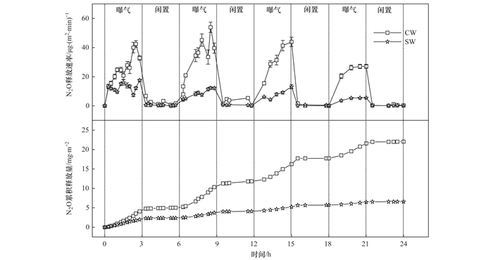CW和SW各階段末端溶解態(tài)N2O濃度如圖 5所示.CW和SW系統(tǒng)平均溶解態(tài)N2O濃度分別為1.05 μg·L-1和0.83 μg·L-1.閑置段末端各系統(tǒng)溶解態(tài)N2O濃度明顯高于曝氣段末端, 這是由于閑置段溶解于水中的N2O在曝氣過(guò)程中被吹脫釋放所致.由于水中N2O溶解度有限, 反應(yīng)初期各濕地N2O釋放速率均較大, CW和SW內(nèi)部溶解態(tài)N2O含量差異不顯著(P>0.05);隨著反應(yīng)進(jìn)行, SW較低的N2O釋放速率使得其內(nèi)部溶解態(tài)N2O濃度低于CW.系統(tǒng)N2O排放主要集中在曝氣段, 而產(chǎn)生的N2O溶解于水中又被吹脫出來(lái), 故系統(tǒng)中溶解態(tài)N2O只占釋放總量的極少部分.