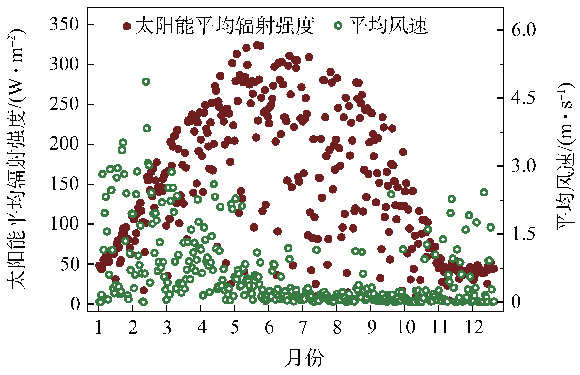 對本實驗所在地生態(tài)系統(tǒng)研究站2016 年的日平均太陽能輻射強度和日平均風(fēng)速的檢測數(shù)據(jù)進(jìn)行分析,結(jié)果如圖2所示。