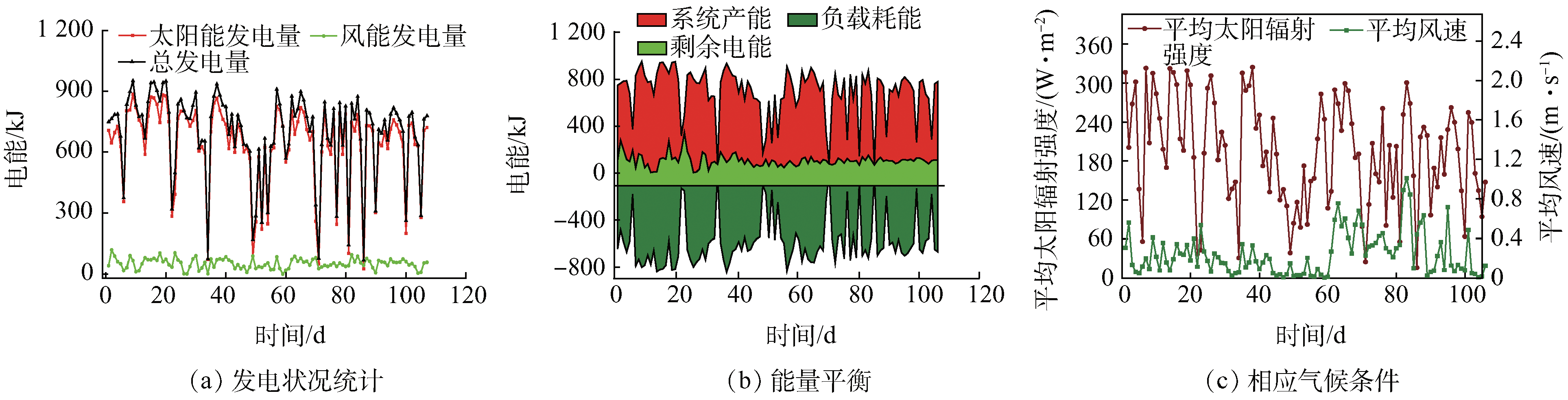 在實驗期間,對生物反應(yīng)器運行穩(wěn)定后光伏發(fā)電板和風(fēng)力發(fā)電機的發(fā)電能力、發(fā)電量、負(fù)載(生物反應(yīng)器)的耗電量以及相對應(yīng)的氣象條件進(jìn)行了連續(xù)監(jiān)測,結(jié)果如圖4所示。