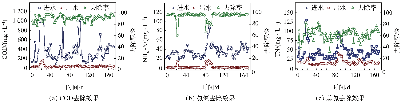 圖5 反應(yīng)器對COD、NH4+-N和TN的去除效果
