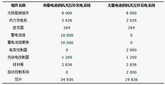 發(fā)電系統(tǒng)中的各組件成本如表2所示。通過對比無蓄電池的風(fēng)光互補發(fā)電系統(tǒng)以及傳統(tǒng)的風(fēng)光互補發(fā)電系統(tǒng)的基礎(chǔ)建設(shè)費用得出,無蓄電池的風(fēng)光互補發(fā)電系統(tǒng)總成本相對于傳統(tǒng)帶有蓄電池的風(fēng)光互補系統(tǒng)降低了43.2%。