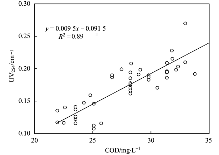 有研究表明, UV254與COD有一定的相關(guān)性, UV254值越小, 可生化性就越強(qiáng), 水中復(fù)雜有機(jī)物分解及去除效果就越好.對本實(shí)驗(yàn)數(shù)據(jù)進(jìn)行COD與UV254之間離散關(guān)系分析如圖 3所示, 并得出相關(guān)系數(shù)為0.89, 說明COD與UV254之間具有強(qiáng)相關(guān)性.具體聯(lián)系污水寶或參見http://wlmqsb.com更多相關(guān)技術(shù)文檔。