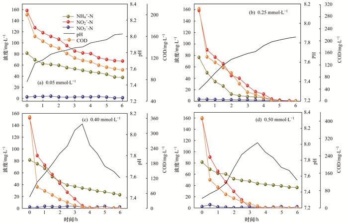 圖 3 不同海藻糖濃度下典型周期內(nèi)氮去除過程當(dāng)海藻糖濃度為0.4 mmol ·L-1和0.5 mmol ·L-1時(shí), 單周期內(nèi)pH值均出現(xiàn)了先升高然后在反應(yīng)時(shí)間3.5 h后下降的現(xiàn)象. NO2--N消耗盡的點(diǎn)剛好為pH下降的點(diǎn), NO2--N消耗盡時(shí), ANAMMOX和反硝化反應(yīng)停止, pH下降可能是由于NH4+和游離氨(FA)之間的化學(xué)平衡導(dǎo)致, OH-消耗使得反應(yīng)器內(nèi)pH值下降.另外, FA的形成會(huì)在一定程度上抑制ANAMMOX過程, 從而使得pH下降. ANAMMOX由于沒有NO2--N可利用, 使得反應(yīng)器內(nèi)的剩余NH4+-N不能被完全轉(zhuǎn)化.出現(xiàn)上升的原因可能是因?yàn)镾BR系統(tǒng)中存在其他形式的氮轉(zhuǎn)化反應(yīng).文獻(xiàn)報(bào)道稱AnAOB能夠表現(xiàn)出異化作用即揮發(fā)性脂肪酸(VFA)氧化以硝酸鹽作為中間產(chǎn)物將NO2--N轉(zhuǎn)化為NH4+-N(DNRA).在批次實(shí)驗(yàn)中, 富集的ANAMMOX和自養(yǎng)菌可以表現(xiàn)出高效率的DNRA耦合ANAMMOX反應(yīng), 從而使得NH4+-N濃度上升.