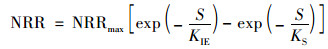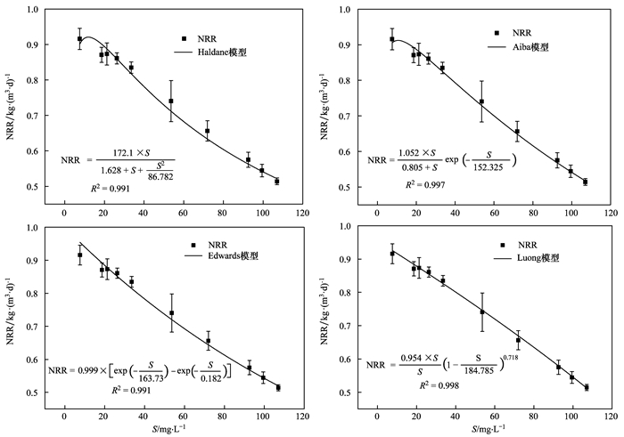 式中, NRRmax為最大基質(zhì)轉(zhuǎn)化速率, kg ·(m3 ·d)-1; S為出水基質(zhì)濃度, mg ·L-1; KS為半飽和常數(shù), mg ·L-1; KIH為Haldane動(dòng)力學(xué)常數(shù), mg ·L-1.