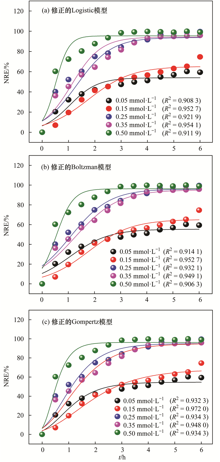 式中, NRE為總氮去除率(%); NREmax為最大總氮去除率(%); Rmax為最大總氮去除速率(% ·h-1); λ為延遲時(shí)間(h); t為反應(yīng)時(shí)間(h).