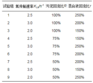 對于A+A2/O工藝而言, 溶解氧、污泥回流比及混合液回流比是對系統(tǒng)的污染物質(zhì)處理效果影響較大的3個工藝參數(shù).好氧池中的溶解氧不足將抑制硝化細(xì)菌的活性及異樣菌的生長, 從而影響有機(jī)物去除、硝化反應(yīng)及吸磷過程.混合液回流比對缺氧池的反硝化過程影響較大, 混合液回流比太小將導(dǎo)致硝化液回流量較少, 不利于系統(tǒng)中TN的去除, 同時, 混合液回流比太大容易將好氧池的溶解氧攜帶到缺氧池, 影響缺氧池的缺氧條件, 抑制反硝化細(xì)菌的活性(徐偉峰等, 2007;吳昌永等, 2012; 陳昆柏等, 2008; Smolders et al., 1995).所以對于特定的工藝運行方式而言, 存在一個最佳的工藝參數(shù)組合.按照4因素3水平的正交試驗表列出了正交試驗方案, 具體見表 5.不同氧轉(zhuǎn)移系數(shù)水平下好氧池中平均溶解氧濃度值列于表 6.