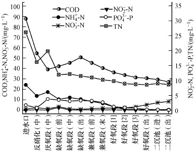 由圖 3可知, 整體上COD依次呈下降趨勢, 生物池中進(jìn)水COD主要消耗在反硝化段和厭氧段生物池, 這兩個過程COD共降低了57%.根據(jù)NO2--N濃度動態(tài)監(jiān)測可知, 在整個過程中, NO2--N的濃度值較為穩(wěn)定.NO3--N濃度整體上依次呈上升趨勢且進(jìn)水濃度相對較低, NO3--N濃度在反硝化段和好氧池出現(xiàn)兩個高峰, 反硝化段出現(xiàn)高峰的主要原因可能是二沉池污泥回流到反硝化段攜帶大量的硝酸鹽溶液, 導(dǎo)致反硝化段呈小幅度上升趨勢.好氧池出現(xiàn)高峰的原因是在好氧條件下, 硝化細(xì)菌利用溶解氧提供的電子將氨氮氧化成硝態(tài)氮, 導(dǎo)致好氧池硝酸鹽濃度上升至8.7 mg·L-1.PO43--P濃度動態(tài)監(jiān)測結(jié)果發(fā)現(xiàn), 該污水處理廠進(jìn)水PO43--P濃度較低, 在厭氧段進(jìn)水口呈上升趨勢;隨后, 在好氧段的進(jìn)水口PO43--P濃度開始下降, 好氧池最終出水PO43--P濃度是0.25 mg·L-1.