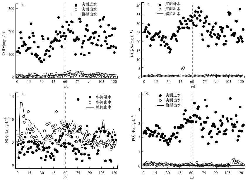 數(shù)值模型經(jīng)過模型動力學(xué)的識別和靈敏度分析后, 利用污水廠前60 d的歷史水質(zhì)監(jiān)測數(shù)據(jù)對FCASM3模型進(jìn)行校核, 再利用污水廠后60 d的歷史數(shù)據(jù)對模型進(jìn)行驗證, 并對校驗后的模型進(jìn)行模擬值與實測值的對比, 評估模型的可靠性及其精度.FCASM3模擬好氧池出水COD、NH4+-N、NO3--N和PO43--P濃度值與實測值對比結(jié)果如圖 5所示.主要模型動力學(xué)參數(shù)校核結(jié)果列于表 9中.