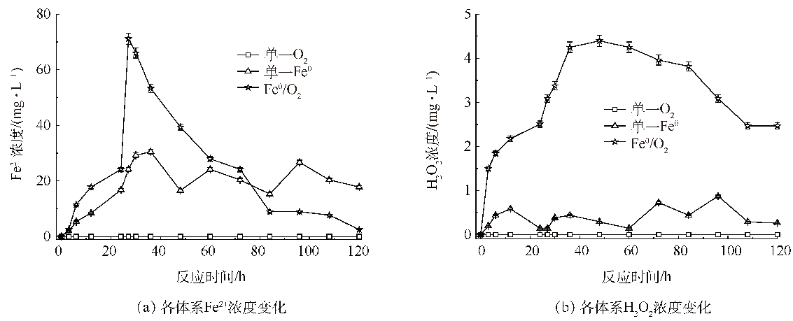 在圖2(b)中,可以觀察到各體系中H2O2含量的變化。單一O2體系中不存在電子供體,氧氣無(wú)法還原為H2O2,因而實(shí)驗(yàn)過(guò)程中沒(méi)有觀察到H2O2的產(chǎn)生。單一Fe0體系中H2O2含量始終低于1 mg·L−1,F(xiàn)e0/O2體系中H2O2含量在48 h前逐漸增加,隨后降低并穩(wěn)定,48 h時(shí)取得最大值,為4.39 mg·L−1。