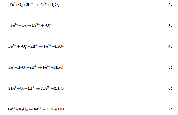 在Fe0/O2體系中,F(xiàn)e0提供電子,促進(jìn)了氧氣的還原生成H2O2,同時(shí),F(xiàn)e0也被氧化生成Fe2+,在酸性條件下,發(fā)生類(lèi)Fenton反應(yīng),相關(guān)反應(yīng)方程如下所示: