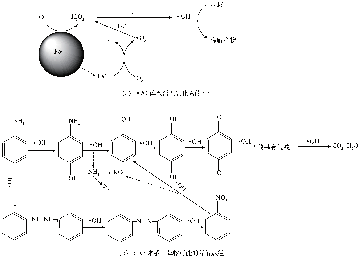 苯胺廢水難以生物降解的原因在于其化學(xué)性質(zhì)穩(wěn)定,苯環(huán)容易發(fā)生親電取代,不易發(fā)生氧化還原反應(yīng),因而苯胺廢水的降解多采用高級(jí)氧化技術(shù)。Fe0/O2體系中不僅存在氧的還原作用產(chǎn)生的H2O2,還可與零價(jià)鐵氧化產(chǎn)生的Fe2+發(fā)生類(lèi)Fenton反應(yīng)產(chǎn)生強(qiáng)化氧化劑·OH等活性氧化物。
