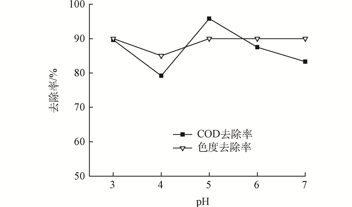 分別取100 mL廢水于250 mL的燒杯中,用1.0 mol·L-1的氫氧化鈉或1.0 mol·L-1鹽酸調(diào)pH為一定值,加入一定量的催化劑,待混勻后加入一定量的過氧化氫溶液,攪拌一段時間后,滴加濃度為1 mol·L-1的氫氧化鈉溶液,調(diào)溶液體系pH至9,等到溶液充分靜置后取上清液測COD值和色度。以COD和色度的去除率來評價催化劑的性能。