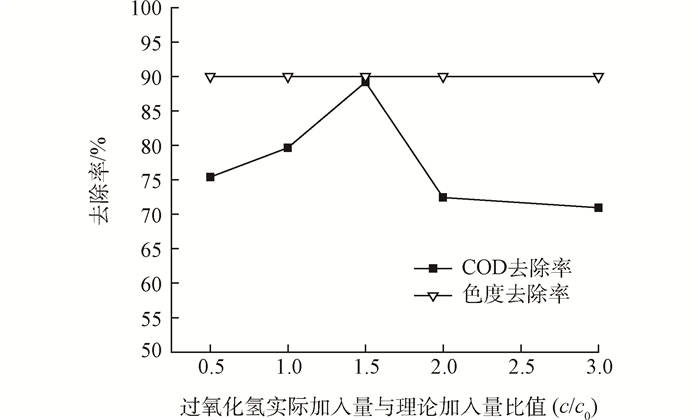 當(dāng)催化劑中ATP與活性炭載體比例為2:1,pH值為5,25 ℃時,改變H2O2加入量,實驗結(jié)果如圖 3所示。由圖 3可知,H2O2加入量對色度的去除率沒有影響,過氧化氫的實際加入量與理論加入量的比值為1.5時,COD的去除率最高,達(dá)到89.2%。而隨著H2O2的減少或者增加,COD的去除率均下降。這是因為隨著H2O2加入量的增多,非均相Fenton反應(yīng)生成的·OH數(shù)量增多,使得COD的去除率增加。當(dāng)H2O2加入量c/c0大于1.5時,COD的去除率反而下降,是因為過量的H2O2成為·OH的捕捉劑,使得·OH數(shù)量減少,故使得COD的去除率反而下降?梢园l(fā)生反應(yīng):