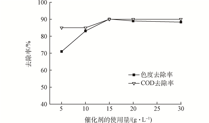 圖4 催化劑加入量對COD和色度的去除率的影響
