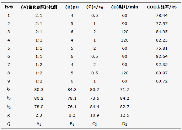設(shè)計正交實驗是為了在單因素實驗的基礎(chǔ)上,進(jìn)一步優(yōu)化反應(yīng),尋找最佳處理效果條件。本實驗采用L9(34)正交實驗表,考察催化劑載體比例(A),pH(B),H2O2實際加入量與理論加入量的比值(c/c0)(C),反應(yīng)時間(D)對COD去除率的綜合影響。催化劑的用量為15 g·L-1,反應(yīng)溫度在25 ℃下進(jìn)行。正交實驗如表 2所示。