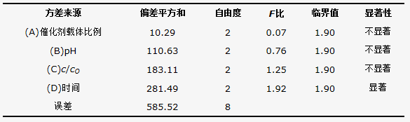 對正交實驗結(jié)果進(jìn)行方差分析,結(jié)果如表 3所示。比較F值和臨界值的大小,可以判定該因素對COD去除效率的差異是否顯著,時間因素F比(因素均方與誤差均方的比值)大于F臨界值,所以時間對COD的去除效率的影響因素差異顯著,而ATP與活性炭的質(zhì)量比,pH值,H2O2的投加量對COD的去除率的影響因素差異不顯著。