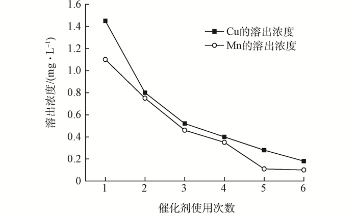 在上述正交實驗得到的最佳實驗組合條件下,待體系反應(yīng)完全后,取上清液用電感耦合等離子體發(fā)射光譜儀(ICP-OES)測定溶液中Cu和Mn的含量。對生化后的印染廢水進(jìn)行COD去除重復(fù)實驗,每次重復(fù)后測定上清液中Cu和Mn的含量。測定結(jié)果如圖 5所示。由圖 5可以看出,催化劑在第1次使用時,銅的溶出濃度為1.45 mg·L-1,錳離子的溶出濃度為1.1 mg·L-1,隨著催化劑使用次數(shù)的增加,銅、錳的溶出量逐漸下降。