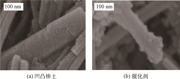 凹凸棒土與催化劑的SEM如圖 6所示。由圖 6可看出,凹凸棒土呈纖維桿狀結(jié)構(gòu),表面凹凸不平,有一定的凹槽,具有較大的表面積,比較適合作為催化劑的載體。加入活性炭的凹凸棒土負(fù)載活性金屬后,金屬氧化物在凹凸棒土表面沉積了細(xì)小的顆粒,載體吸附的金屬離子經(jīng)過高溫煅燒后形成金屬氧化物聚集在載體表面。使得載體具有良好的催化性能。