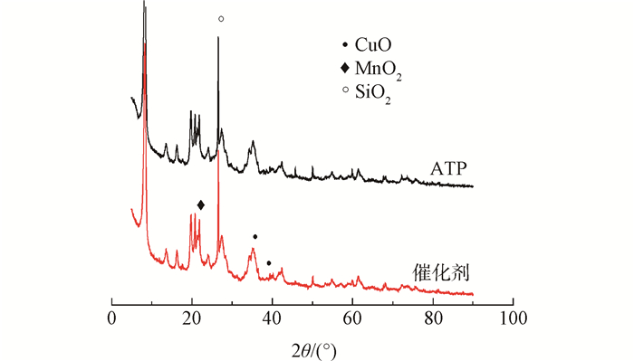 使用XRD圖譜來分析催化劑表面金屬離子的負(fù)載形式。本實驗對凹凸棒土和催化劑進(jìn)行了XRD分析。從圖 7可看出,在催化劑的XRD圖譜中,2θ為35.2°、42.1°出現(xiàn)了CuO的衍射峰,2θ為22.0°、34.9°出現(xiàn)了MnO2的衍射峰,而ATP的XRD圖譜中沒有出現(xiàn)。說明通過浸漬法,催化劑的活性組分是以CuO和MnO2的形式存在于催化劑載體的表面。