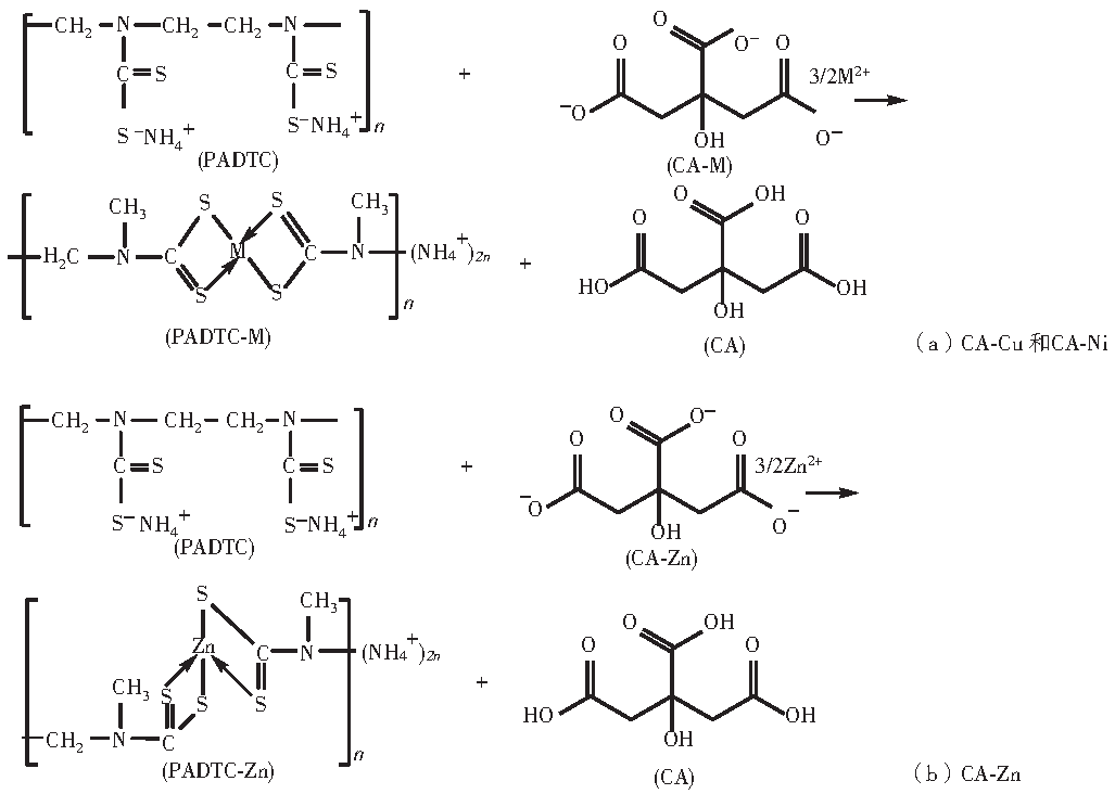 以絡(luò)合劑CA為例,PADTC抓捕重金屬的機(jī)理如圖5所示(其中M 代表Cu 或者Ni)。銅原子的原子序數(shù)為29,其失去3d軌道和4s軌道的2個電子后形成銅離子,銅離子在與PADTC形成配合物時,采取dsp2雜化軌道成鍵,構(gòu)型為平面四方形結(jié)構(gòu),中心離子銅的配位數(shù)為4,機(jī)理如圖5(a)所示。Ni的電子結(jié)構(gòu)為3d84s2,失去4s軌道上的2個電子后形成鎳離子。當(dāng)PADTC抓捕鎳離子時,鎳離子的8個3d電子發(fā)生重排,空出一個d軌道與4s和4p軌道雜交成dsp2軌道。雜化軌道為平面四方形結(jié)構(gòu),所以PADTC-Ni 是平面正方形。反應(yīng)抓捕機(jī)理和銅類似,也是形成平面正方形,如圖5(a)所示。Zn 的電子結(jié)構(gòu)為3d104s2,失去4s軌道上的2個電子形成鋅離子。當(dāng)與PADTC反應(yīng)時,鋅離子的3d軌道是飽和的,因此,形成sp3 軌道,構(gòu)型為正四面體結(jié)構(gòu),中心離子的配位數(shù)也為4,抓捕機(jī)理如圖5(b)所示。
