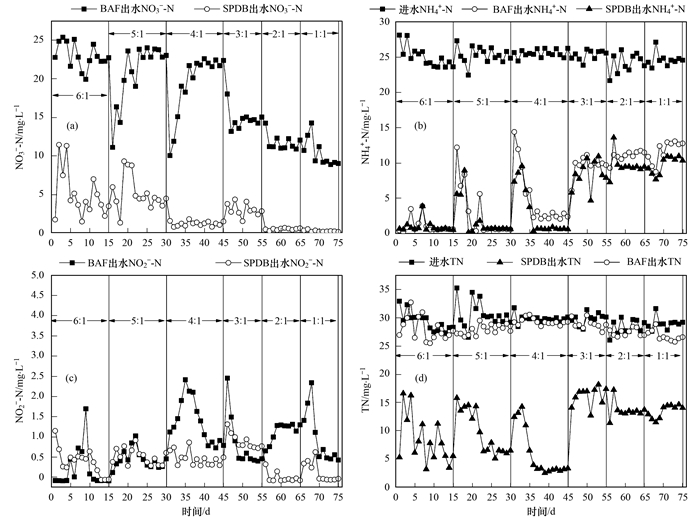 (1) BAF-SPDB工藝中BAF的最佳氣水比為4 :1.在該氣水比條件下, BAF和SPDB針對(duì)低碳源污水可同時(shí)獲得理想的硝化和反硝化效果, 并且BAF-SPDB工藝對(duì)TN的去除率可達(dá)到91.6%.