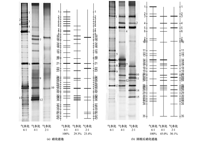 圖 3 不同氣水比條件下生物膜樣品的DGGE條帶及量化分析圖 3(b)所示為不同氣水比條件下固相反硝化濾池生物膜樣品的DGGE圖譜及量化分析.從中可以看到, 氣水比的變化對(duì)微生物的多樣性有一定的影響, 但是影響程度較小, 各泳道上的條帶數(shù)(從氣水比為6 :1時(shí)的21減少到氣水比為2 :1時(shí)的15)變化較小.說明氣水比的變化對(duì)固相反硝化濾池微生物多樣性的影響程度要低于硝化濾池.條帶1、3、8、13和15各個(gè)泳道中都有出現(xiàn)且濃度較高, 說明這些條帶代表的微生物都是優(yōu)勢(shì)菌群, 且具有很強(qiáng)的適應(yīng)性和較寬的生態(tài)幅.此外, 當(dāng)氣水比降低到2 :1時(shí), 這些條帶的信號(hào)亮度出現(xiàn)了明顯的上升, 說明低溶解氧的環(huán)境有利于這些微生物的生長, 使得這些微生物的生長速率增加, 數(shù)量上升.條帶2、11、12和14所代表的菌群隨著氣水比的降低逐漸在固相反硝化濾池中成為優(yōu)勢(shì)菌群, 表明這類菌群是缺氧或厭氧微生物, 可以通過控制氣水比使這些菌群富集.此外, 有些微生物菌落只在特定的條件下才會(huì)出現(xiàn).如條帶5和9代表的菌落只在氣水比為6 :1時(shí)出現(xiàn), 而條帶7只有在氣水比為4 :1時(shí)才出現(xiàn).