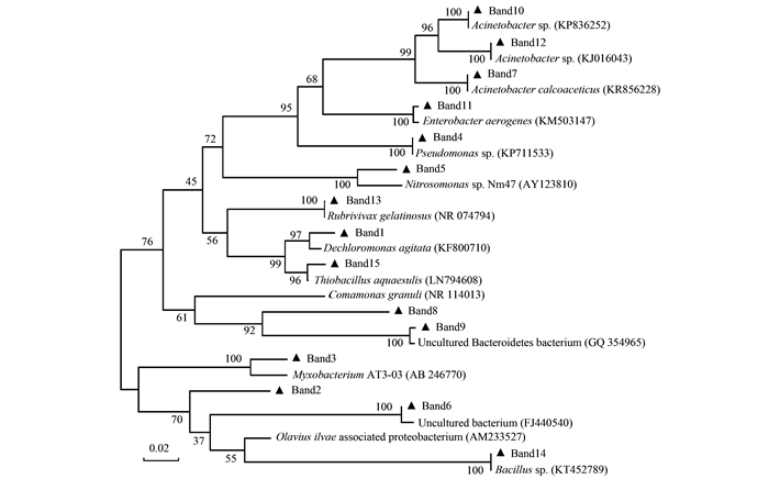 表 3和圖 5所示分別為固相反硝化濾池DGGE凝膠條帶回收序列分析結(jié)果及主要菌落的系統(tǒng)發(fā)育樹.從中可以看出, 條帶1、3、8和13對(duì)應(yīng)的菌株分別為Dechloromonas agitata、Myxobacterium AT3-03、Comamonas granuli和Rubrivivax gelatinosus. Ginige等的研究表明, Dechloromonas是以甲醇作為碳源馴化的活性污泥中的主要反硝化菌. Manucharova等的研究發(fā)現(xiàn), Myxobacteria可以以固體碳源(草生灰化石)作為唯一碳源進(jìn)行反硝化, 并且該菌株在草生灰化石中是最活躍的反硝化菌, 表現(xiàn)出最強(qiáng)的反硝化活性. Comamonas granuli菌株屬于叢毛單胞菌科, 具有將硝態(tài)氮還原成亞硝態(tài)氮的能力; Rubrivivax gelatinosus可以將亞硝態(tài)氮還原為氮?dú)? 但是不能以硝態(tài)氮作為電子受體.上述條帶對(duì)應(yīng)的反硝化菌群是固相反硝化濾池中的優(yōu)勢(shì)菌群, 且在3個(gè)氣水比條件下的泳道中都存在, 表明氣水比的變化對(duì)固相反硝化濾池中的優(yōu)勢(shì)菌反硝化菌的影響較小.當(dāng)氣水比降低到2 :1時(shí), 上述條帶代表的微生物的數(shù)量出現(xiàn)了較明顯的增加, 說明在低氣水比條件下, 硝化濾池中出水?dāng)y帶進(jìn)入固相反硝化濾池的溶解氧濃度低, 在固相反硝化濾池中營造了良好的缺氧環(huán)境, 有利于反硝化菌的生長和繁殖.條帶5與菌株Nitrosomonas sp. Nm47最接近.從前面的分析已知, Nitrosomonas sp. Nm47是典型的氨氧化菌.該菌在固相反硝化濾池生物膜中的出現(xiàn), 表明表層生物膜存在一定濃度的溶解氧.造成這種情況的原因可能在于, 在氣水比較高的情況下, 硝化濾池未被完全利用的溶解氧隨出水進(jìn)入到固相反硝化濾池中, 而反硝化濾池底部固相碳源材料在微生物降解作用下釋放的有機(jī)碳源在好氧微生物的呼吸作用下消耗的溶解氧有限, 部分未被消耗的溶解氧進(jìn)入濾池中部填料表面的生物膜.當(dāng)氣水比降低到4 :1, 條帶5消失了, 說明硝化濾池出水中的溶解氧濃度較低, 且在固相反硝化濾池底部就被消耗掉了, 可以保持較好的缺氧環(huán)境.對(duì)比不同氣水比條件下固相反硝化濾池的反硝化效果的研究(圖 2)結(jié)果也證實(shí)了這一點(diǎn).當(dāng)氣水比為6 :1時(shí), 固相反硝化濾池出水的硝態(tài)氮濃度波動(dòng)較大, 表明反硝化受到硝化濾池出水中溶解氧的影響.但是, 當(dāng)氣水比為4 :1時(shí), 出水中的硝態(tài)氮?jiǎng)t一直維持在較低的水平.條帶4對(duì)應(yīng)的菌株為Pseudomonas sp..付曉的研究發(fā)現(xiàn)Pseudomonas sp.可以通過分泌PCL解聚酶將PCL分解為PCL單體和二聚體, 而據(jù)Honda等的研究發(fā)現(xiàn), 反硝化菌可直接利用PCL的單體和二聚體作為電子供體進(jìn)行反硝化.此外, Pseudomonas sp.還是一種好氧反硝化菌, 在有溶解氧存在的條件下可以利用氧氣作為電子受體進(jìn)行反硝化作用.條帶12、14和15對(duì)應(yīng)的菌株分別是Acinetobacter sp.、Bacillus sp.和Thiobacillus aquaesulis, 這些菌株均屬于好氧反硝化菌. Acinetobacter sp.受氣水比的影響較小, 而Bacillus sp.和Thiobacillus aquaesulis則隨著氣水比的降低逐漸成為優(yōu)勢(shì)菌株.說明氣水比的降低有利于固相反硝化濾池中好氧反硝化菌的富集.