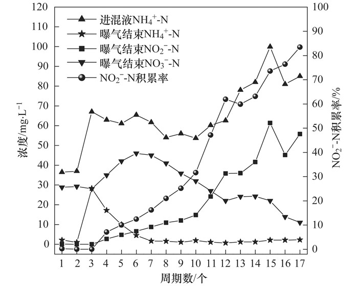 圖 1 NH4+-N、NO3--N、NO2--N及NO2--N積累率隨馴化周期的變化過程在前兩個(gè)周期, 將淀粉廢水稀釋使進(jìn)混液的NH4+-N濃度為36 mg·L-1左右, 由圖 1可見, 取來的接種污泥具有良好的硝化性, 但曝氣結(jié)束時(shí)混合液的NO2--N濃度幾乎為0 mg·L-1, 說明接種的污泥為全程硝化污泥.