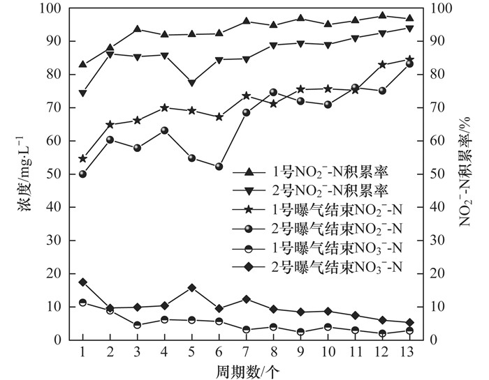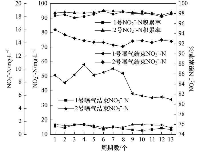 取自企業(yè)的生產(chǎn)廢水水質(zhì)具有波動(dòng)性, 本試驗(yàn)階段進(jìn)混液NH4+-N的平均濃度為91 mg·L-1(略高于上一階段), 13個(gè)周期的試驗(yàn)結(jié)果見圖 2.從中可見, 降低污泥濃度后, 兩個(gè)反應(yīng)器同樣都能夠獲得良好的硝化效果, 但pH的變化, 對(duì)NO2--N的積累率有一定影響.控制pH的1號(hào)系統(tǒng), 曝氣結(jié)束時(shí)繼續(xù)延續(xù)了NO2--N積累率持續(xù)上升的趨勢(shì), 并在第7周期積累率達(dá)到95%以上, 之后積累率在緩慢上升過程中漸近穩(wěn)定, 曝氣結(jié)束時(shí)相應(yīng)的NO3--N濃度也在緩慢下降過程中趨于2~3 mg·L-1.取消對(duì)pH限制的2號(hào)系統(tǒng), 第1周期NO2--N的積累率由83.4%降至74.6%, 曝氣結(jié)束時(shí)NO3--N濃度超過17 mg·L-1, 在之后的6個(gè)周期中NO2--N積累率具有波動(dòng)性, 從第7周期開始NO2--N的積累率恢復(fù)上升趨勢(shì), 最后運(yùn)行到第13周期, 積累率上升至94%, 曝氣結(jié)束時(shí)NO3--N濃度降至5.3 mg·L-1.可見, 在曝氣過程中取消對(duì)系統(tǒng)pH的限制, 對(duì)于已經(jīng)啟動(dòng)短程硝化的玉米淀粉廢水SBR處理系統(tǒng), 維持較高的溫度和較低的DO, 并結(jié)合對(duì)硝化過程的在線控制, 同樣可獲得穩(wěn)定的短程硝化效果.