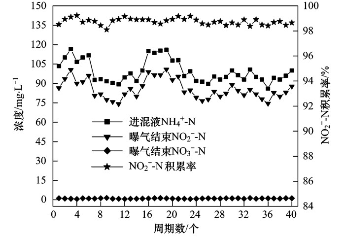 不計(jì)馴化階段的運(yùn)行周期數(shù), 后面3個(gè)階段1號(hào)和2號(hào)系統(tǒng)都運(yùn)行了39個(gè)周期, 其中在溫度為23~24℃和不限制曝氣過程pH的條件下, 1號(hào)系統(tǒng)連續(xù)運(yùn)行了13個(gè)周期, 2號(hào)系統(tǒng)連續(xù)運(yùn)行了26個(gè)周期.在這39個(gè)周期中, 兩系統(tǒng)都獲得了短程硝化的穩(wěn)定運(yùn)行, 并且NO2--N的積累率總體上都能夠逐漸提高至98%左右后趨于穩(wěn)定.為了進(jìn)一步考證在常溫(23~24℃)和不限制pH的條件下, 短程硝化的長(zhǎng)期穩(wěn)定性, 對(duì)于2號(hào)系統(tǒng), 采用自動(dòng)控制裝置, 以原水為進(jìn)水, 仍然按照分兩次進(jìn)水的運(yùn)行方式周期式自動(dòng)運(yùn)行, 控制正常硝化段DO為0.7~1.0 mg·L-1, 每天運(yùn)行1周期, 一共運(yùn)行了40個(gè)周期, 試驗(yàn)結(jié)果見圖 5.