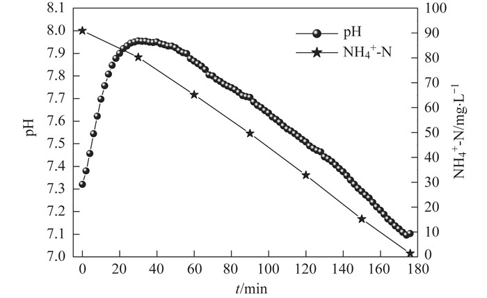 本試驗(yàn)在短程硝化運(yùn)行穩(wěn)定階段, 在常溫和取消對(duì)pH限制的條件下, pH和NH4+-N隨曝氣時(shí)間變化的典型周期見圖 6.從中可見, 在176 min的曝氣過程中, pH的變化范圍是7.1~8.0.按照上述觀點(diǎn), 這一pH范圍均適宜AOB生長(zhǎng).