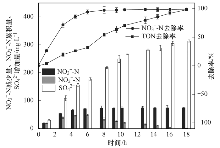 反應過程中NO3--N、NO2--N濃度的變化所反映的動力學為物料關系提供認識基礎. 圖 4為反應器穩(wěn)定運行3個月含硫鐵泥和污泥的混合物間歇實驗其運行過程的NO3--N、NO2--N、SO42-濃度變化.從中可以看出: NO3--N、NO2--N初始濃度分別為75.31 mg·L-1、1.58 mg·L-1, 反應到第6 h, NO3--N濃度降至4.29 mg·L-1, 去除率為94.15%, NO2--N的濃度達到最大值48.02 mg·L-1, 累積率為61.67%;第6~18 h, NO3--N濃度波動不大, NO2--N濃度從48.02 mg·L-1下降到0.78 mg·L-1; 此外第12 h, NO2--N的累積率約為22.44%, 與連續(xù)運行第二階段(HRT=12 h)的NO2--N的累積率非常接近; 在第18 h, 出水TON濃度為1.52 mg·L-1, 去除率達到98.02%, 與連續(xù)運行的第三階段(HRT=18 h)相吻合.具體聯系污水寶或參見http://wlmqsb.com更多相關技術文檔。