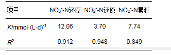 式中, m、n為反應級數; K為NO3--N和化學硫鐵泥反應的速率常數, mmol·(L·d)-1; K′為NO2--N還原速率常數, mmol·(L·d)-1; K″為NO2--N的累積速率常數, mmol·(L·d)-1.