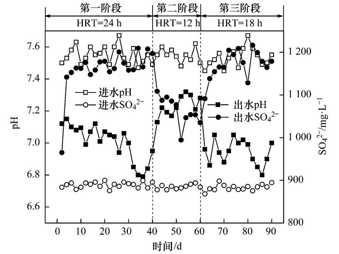 以低價硫作為反硝化電子供體, 普遍存在產酸和副產物SO42-的問題.本實驗測試了反應器進出水的pH值和SO42-濃度變化, 結果如圖 5所示.進水pH值為(7.54±0.06), 在第一和第三階段系統(tǒng)穩(wěn)定運行后, 出水沒有NO2--N的累積和NO3--N的殘余, 出水pH穩(wěn)定在6.98±0.10, 值得指出的是, 出水pH從第40 d的6.79上升到第42 d的7.22, 然后在第42~60 d的出水pH穩(wěn)定在7.24±0.05. pH值的變化表明, 硫鐵泥作為電子供體反硝化脫氮是一個產酸的反應, 溶液pH值可能會調控硫鐵泥釋放電子的能力.進水SO42-濃度為(886.23±7.11) mg·L-1, 在第一和第三階段出水SO42-濃度穩(wěn)定在(1 173.17±22.35) mg·L-1, 在第二階段出水SO42-濃度從1 196.9 mg·L-1下降到1 087.3 mg·L-1, 然后第42~60 d出水SO42-濃度穩(wěn)定在(1 063.6±32.12) mg·L-1.根據反應式(2), SO42-離子的產生量和TON的去除率呈正相關, 第44~60 d的TON去除率從96.97%降到52.92%, 此階段SO42-只增加了(179.00±33.87) mg·L-1, 明顯低于第一、第三階段的(283.99±26.71) mg·L-1.表明該脫氮過程為固相硫化物經微生物氧化轉化為溶解性的硫酸鹽, 同時釋放電子還原硝酸根.在此之前提到基于硫的自養(yǎng)反硝化生物過濾器, 其化學原理如反應式(7)所示: