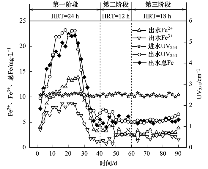 目前很多研究表明生物出水及自然水體中的溶解性有機物與鐵離子絡合, 造成水質的色度、UV254、鐵離子濃度等指標的變化.本研究的出水總鐵、Fe3+、Fe2+濃度及進出水UV254的變化如圖 6所示.在反應器運行初期(第0~30 d), 出水有Fe3+、Fe2+的大量溢出, 最高濃度分別達到8.75 mg·L-1、13.89 mg·L-1, 總Fe濃度的平均值為16.77 mg·L-1; 第40 d出水Fe3+、Fe2+濃度分別降到1.78 mg·L-1、4.28 mg·L-1, 然后在第40~90 d的出水Fe3+、Fe2+波動不大, 濃度分別為(2.24±0.66) mg·L-1、(3.02±0.56) mg·L-1.反應器中鐵的可能形態(tài)有FeS、Fe(OH)2、Fe(OH)3等, 它們的Ksp分別為6.3×10-18、8.0×10-16、4.0×10-39, 在pH值6~8的情況下, 溶解態(tài)的鐵離子濃度不可能達到mg級, 結合圖 6可以推斷, 鐵離子濃度和出水UV254值的變化是相關聯的, 根據文獻報道, 鐵離子與有機物絡合會導致UV254的上升, 啟動初期, 反應器中以殘余溶解性有機物為碳源的異樣反硝化微生物豐度較低, 造成溶解性有機物和鐵離子(Fe2+、Fe3+)絡合, 進而出現鐵離子溢出和UV254的升高.