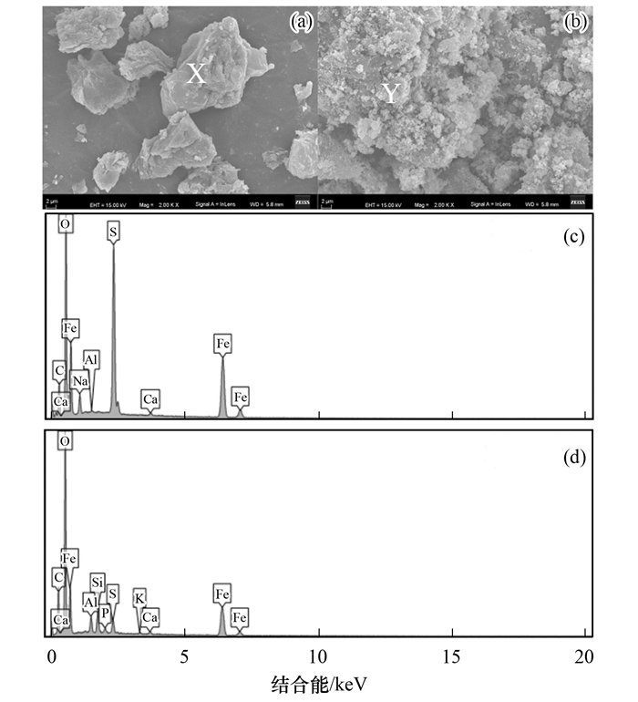 硫鐵泥來源于韶鋼焦化廢水處理二期工程一級預處理工藝亞鐵鹽絮凝沉淀單元, 預處理前后廢水的主要水質指標變化為: TOC值和S2-濃度分別從1 355.7 mg·L-1和523.7 mg·L-1降至1 284.2 mg·L-1和7.2 mg·L-1.取預處理單元重力沉降30 min后的化學污泥1 L, 加無氧去離子水反復清洗至外排上清液COD值小于5.0 mg·L-1.密封保存清洗后的硫鐵泥1 L, 取攪拌均勻的硫鐵泥10 mL, 真空冷凍干燥稱量質量0.37 g, 即保存1 L混合物中硫鐵泥的濃度為37 g·L-1.從含硫鐵化學污泥的EDS譜圖(圖 1)可以看出硫鐵泥的粒徑基本在50 μm以內, 顆粒間有團聚, 元素成分為: Fe 51.55%, S 18.93%, C 15.40%, O 11.77%, Na 1.67%, Ca 0.56%, Al 0.13%, 其中Fe和S的總含量占比為70.48%.